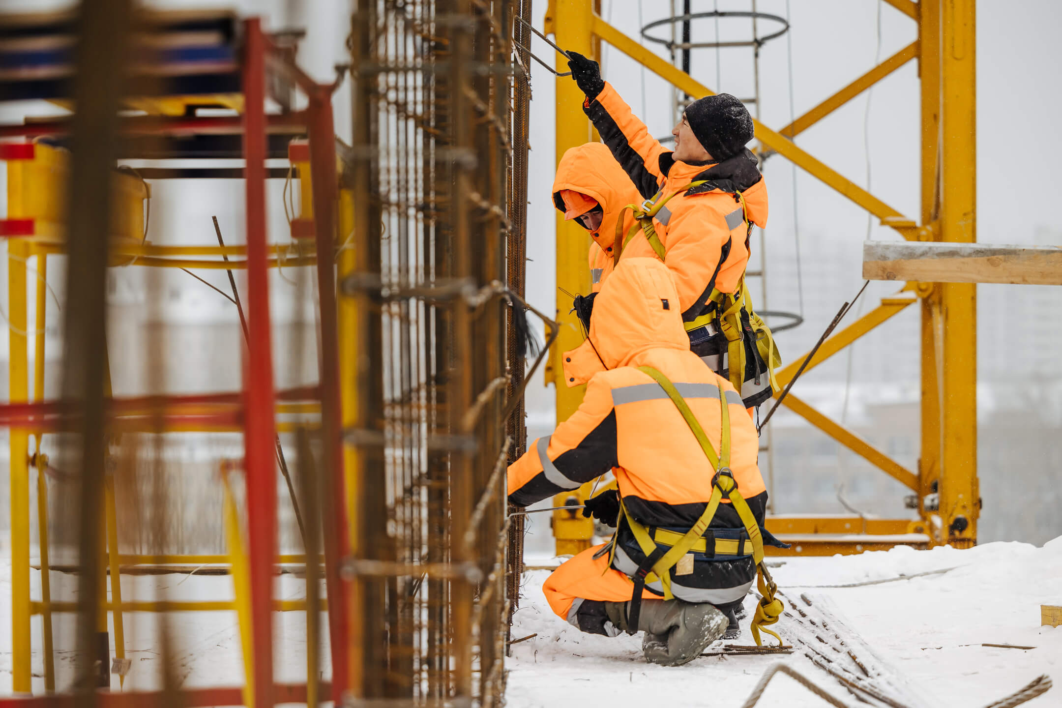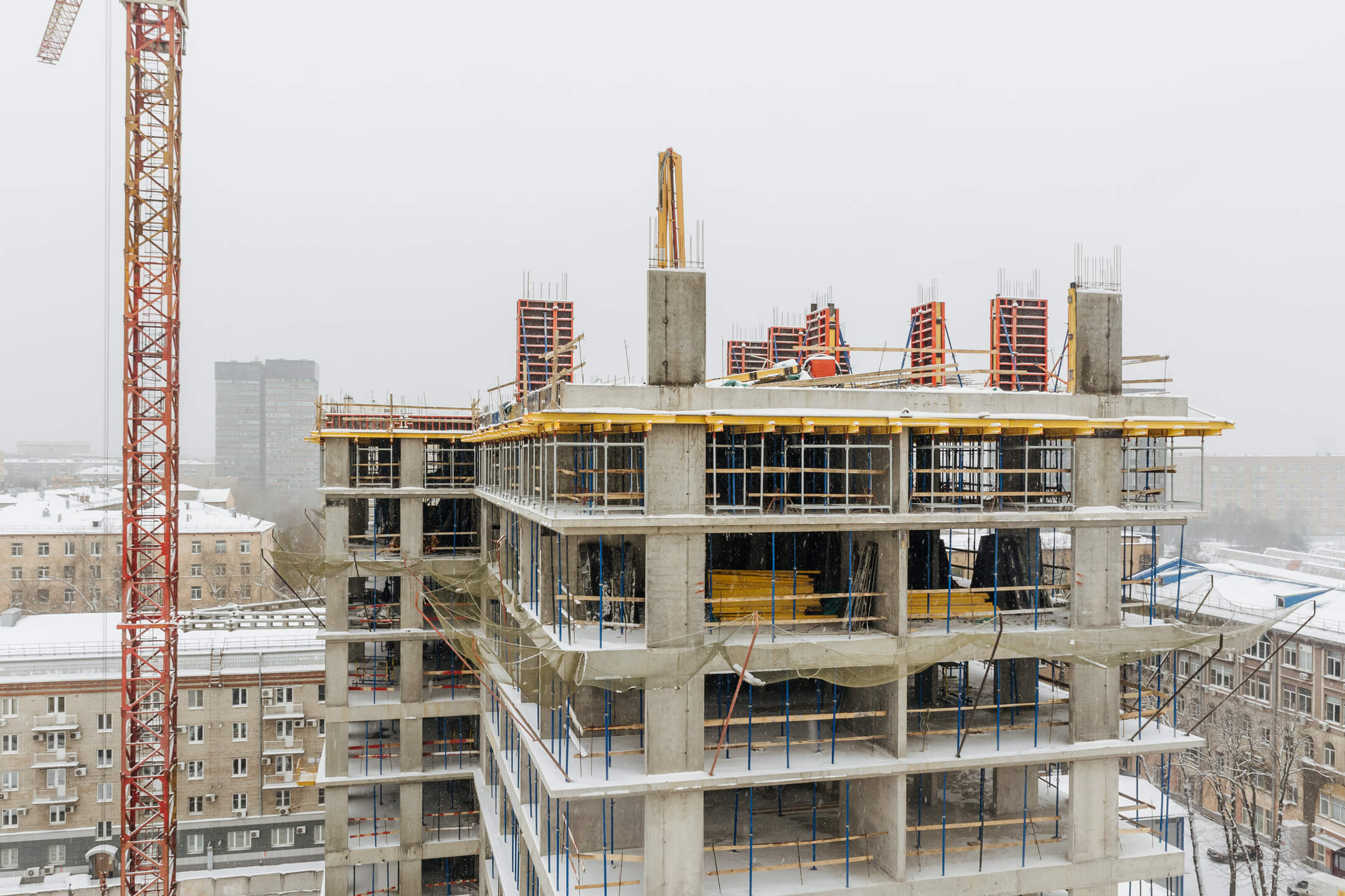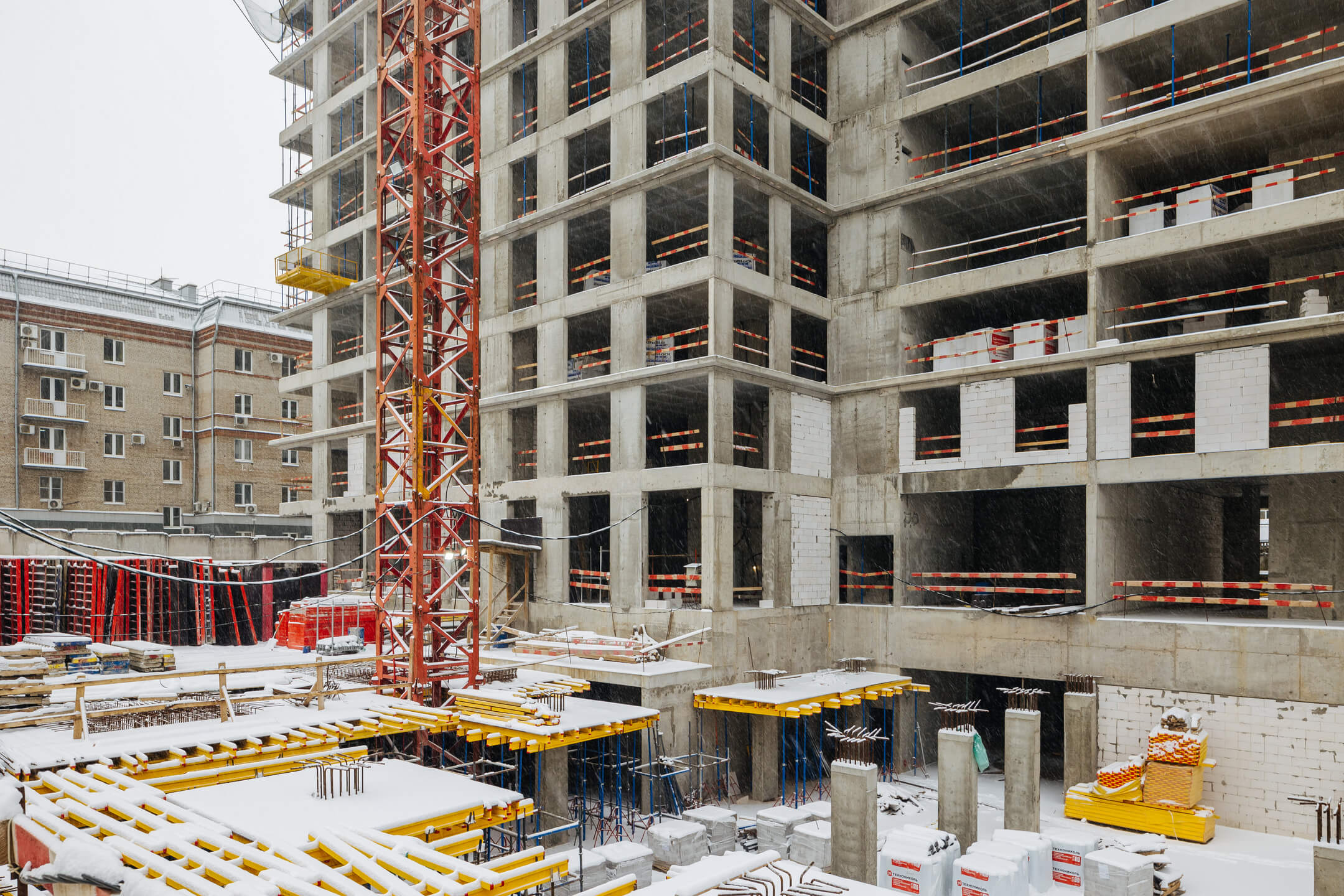 Этап 1.1 (паркинг): производятся работы по армированию и бетонированию стен и покрытия паркинга, гидроизоляция наружных стен и кровли стилобата, устройство пристенного дренажа, отсыпка пазух котлована, кладка стен и перегородок подземного этажа;
