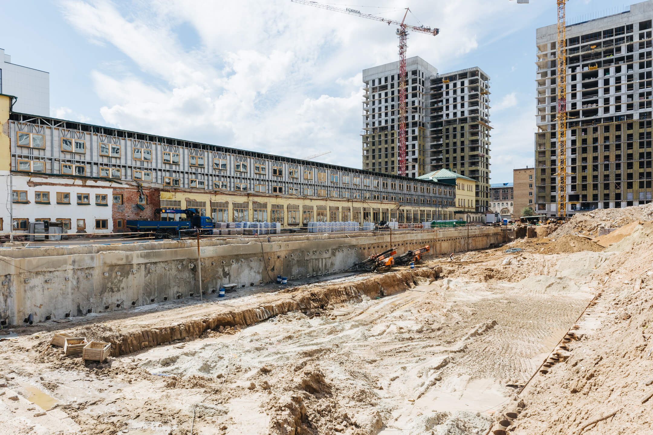 Этап 1.1 (паркинг): армирование/бетонирование стен и покрытия паркинга и рампы. Гидроизоляция наружных стен и кровли стилобата. Устройство пристенного дренажа, прокладка наружных инженерных систем. Отсыпка пазух котлована, кладка стен и перегородок подземного этажа. Отделка технических помещений. Отделка кладовых. Продолжаются работы по устройству отопления, вентиляции, противопожарного водопровода в рамках внутренних инженерных систем.