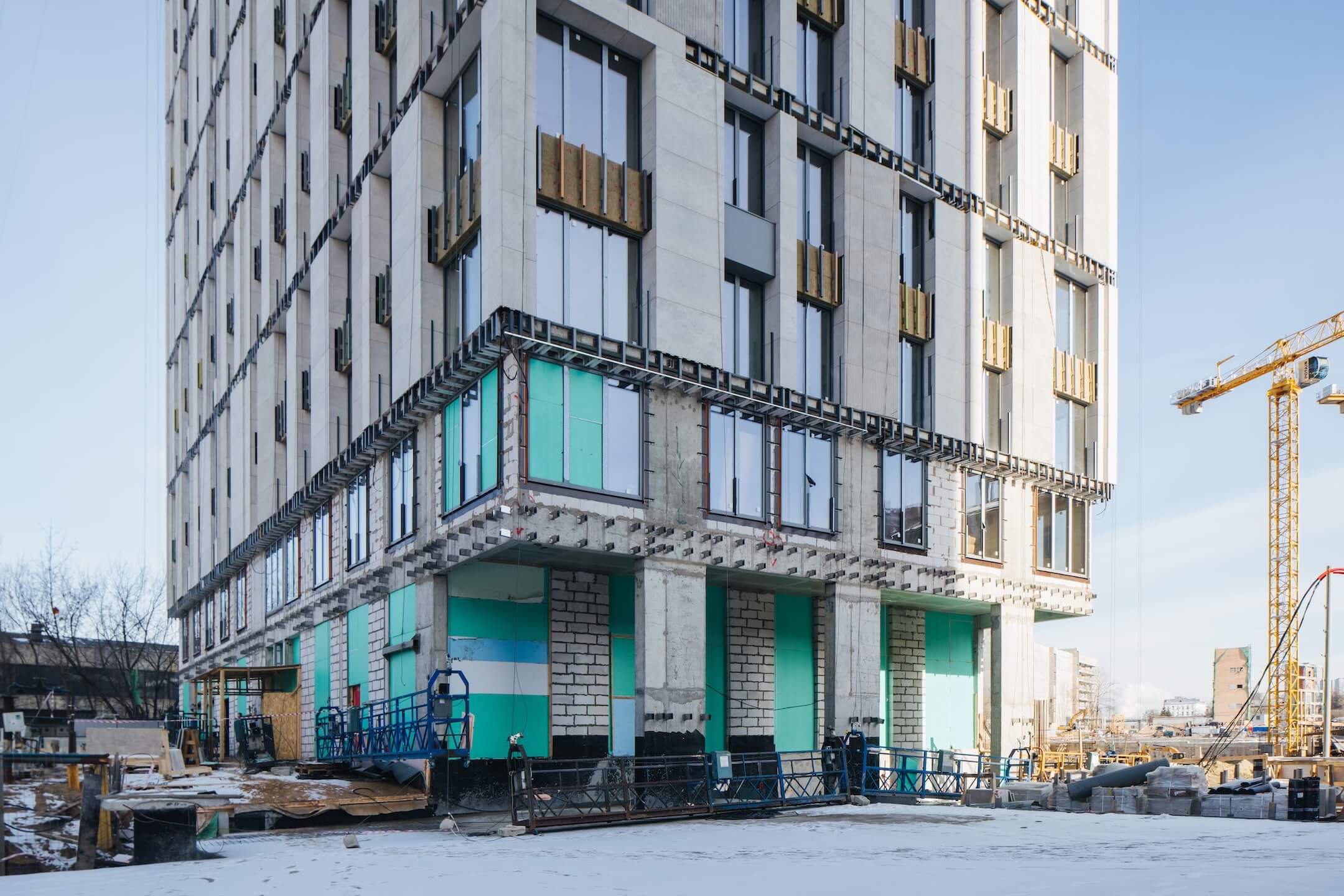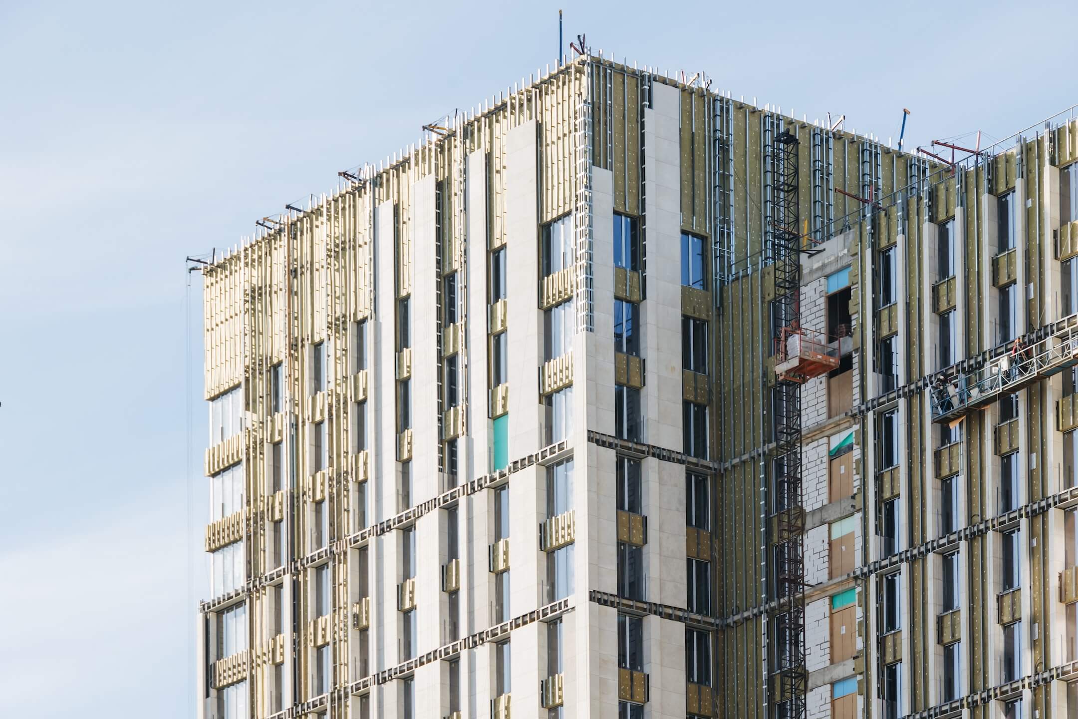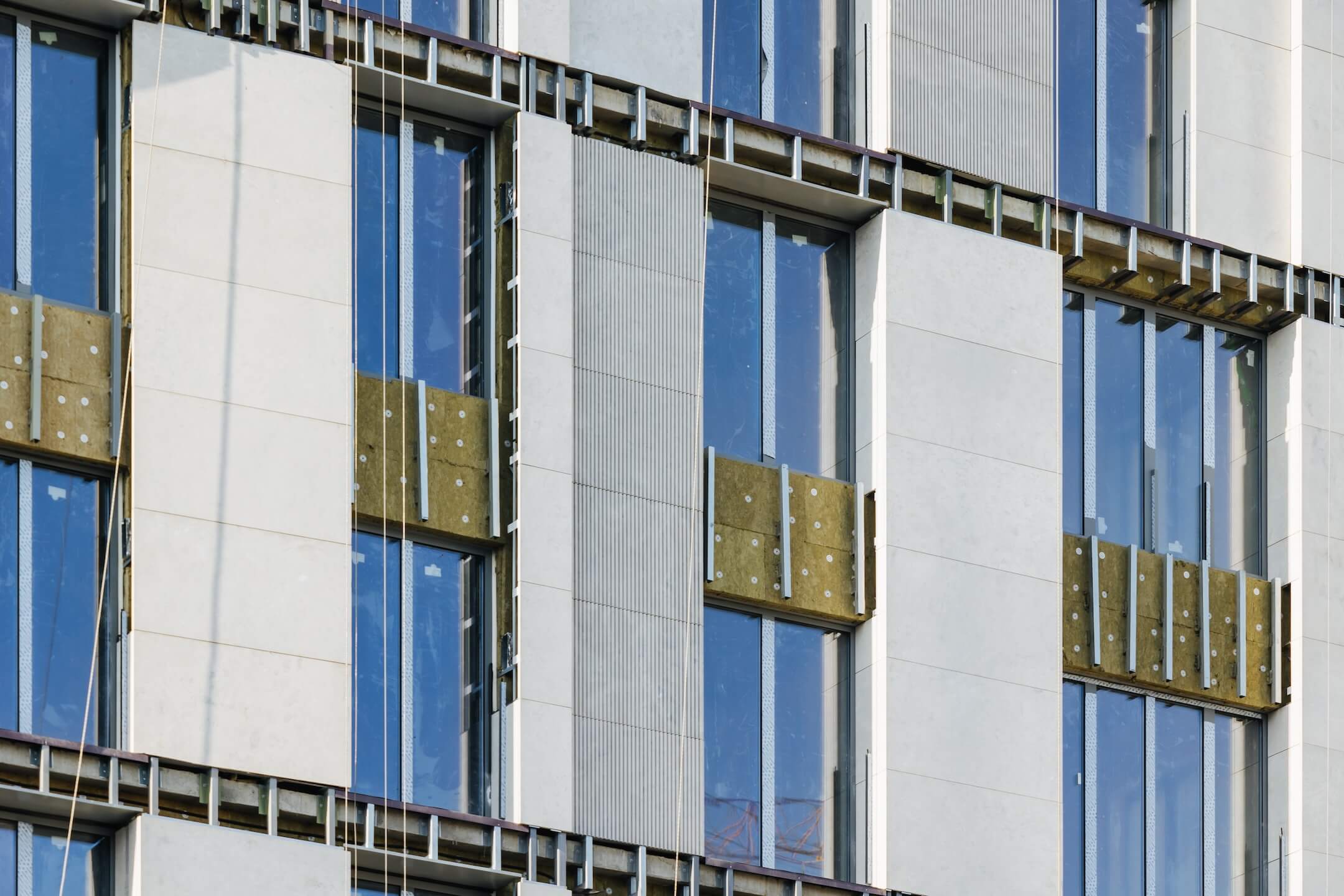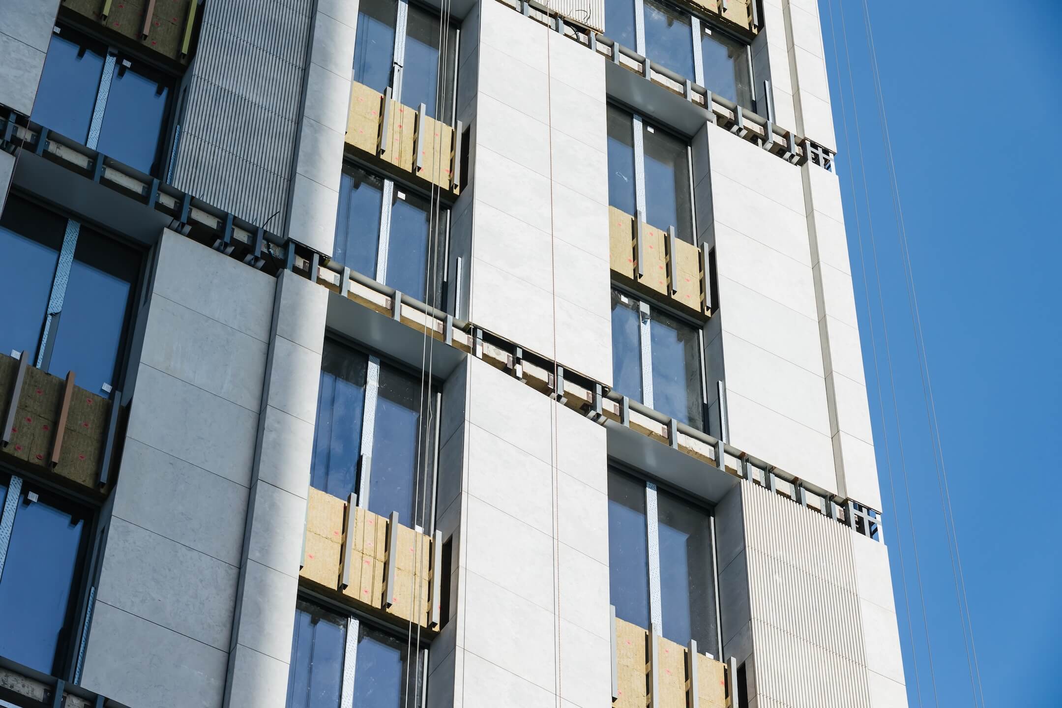 - Фасад. Монтаж минераловатного утеплителя. Монтаж подсистемы. Монтаж облицовки из натурального камня. Монтаж окон типовых этажей.