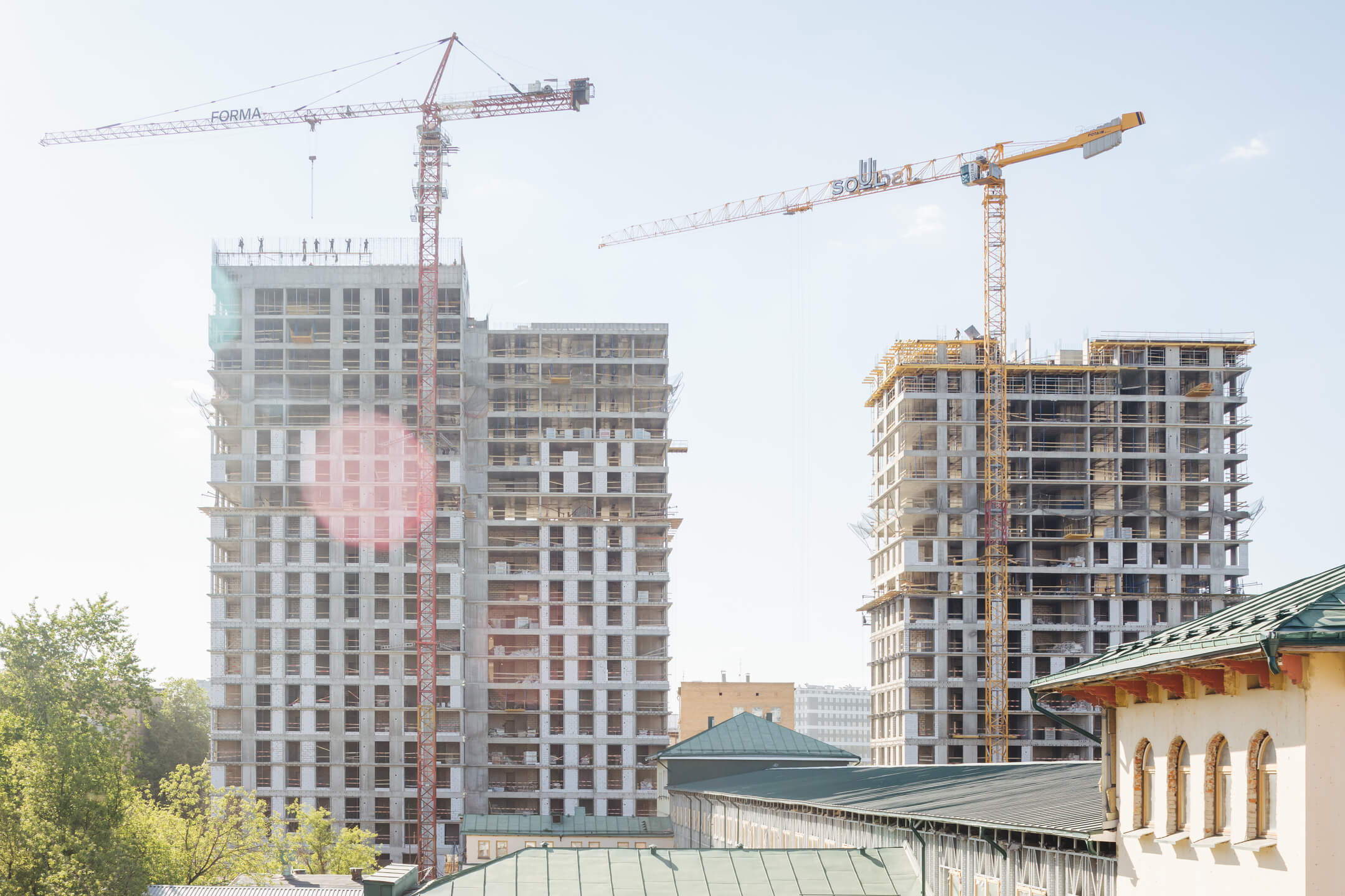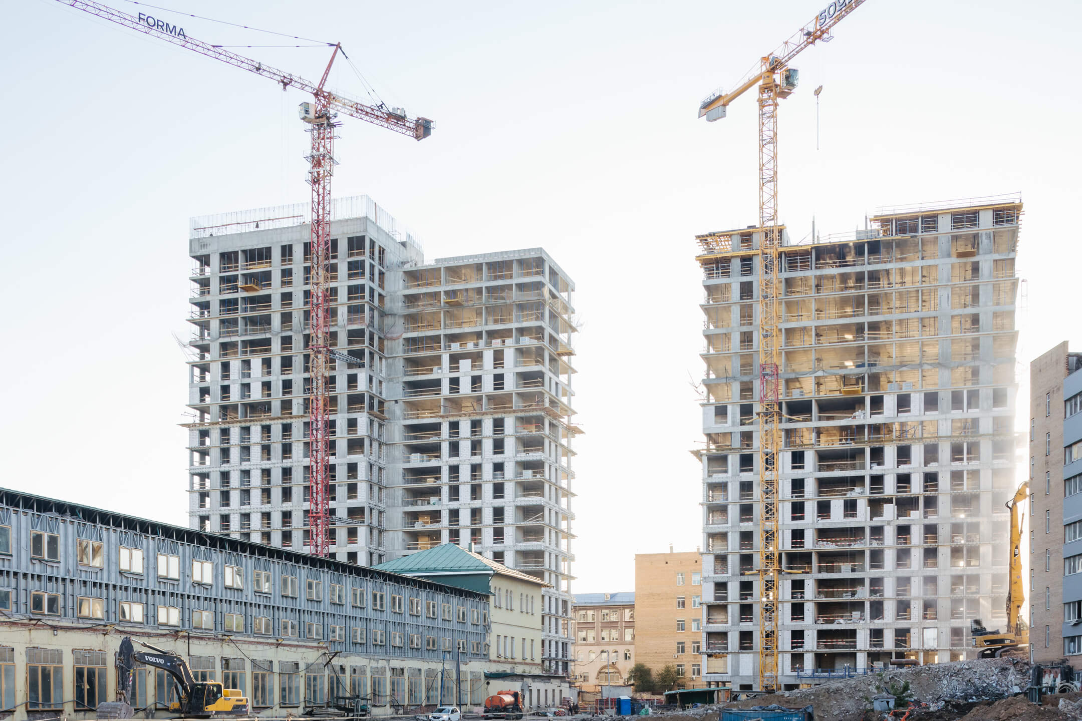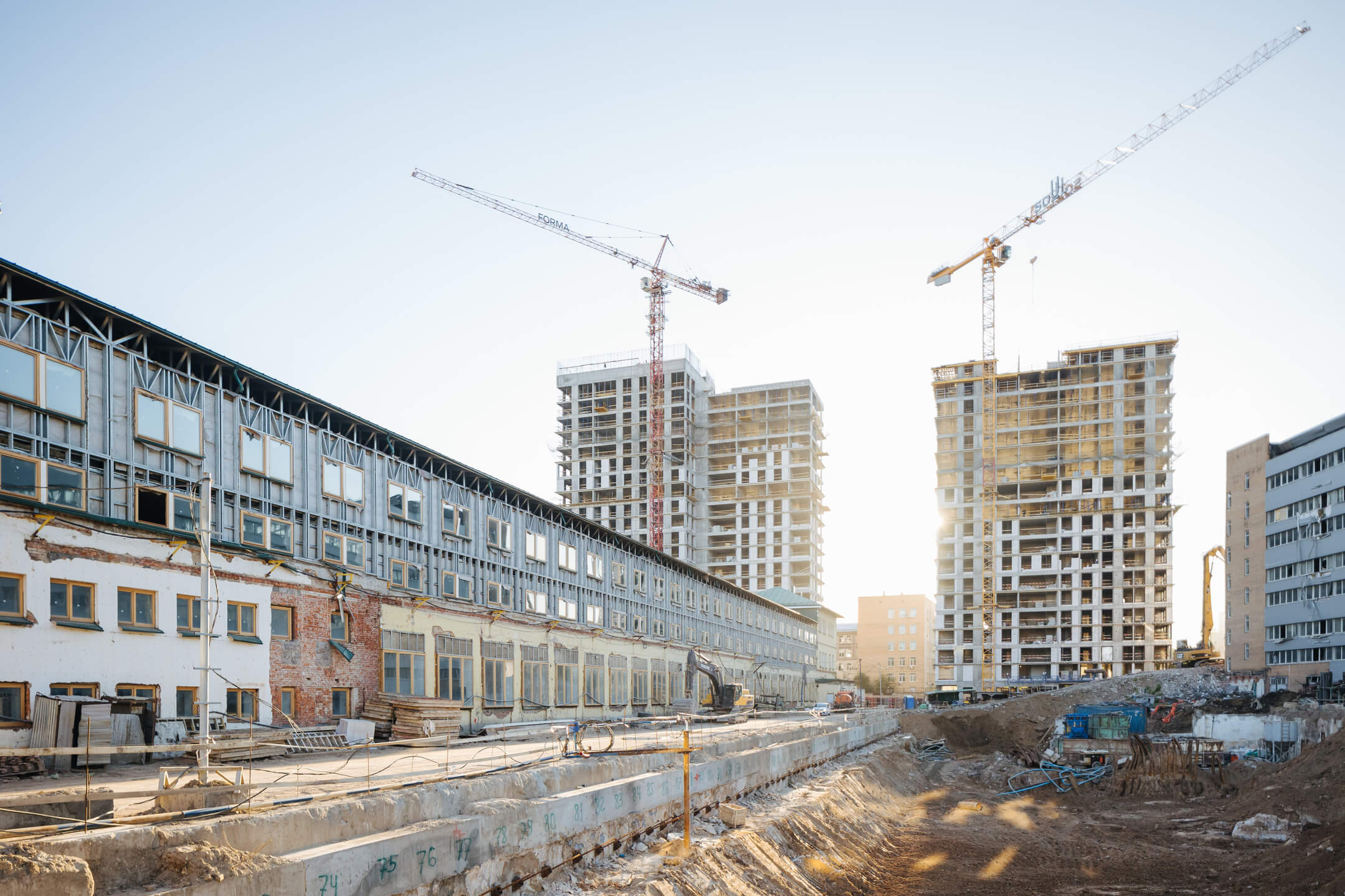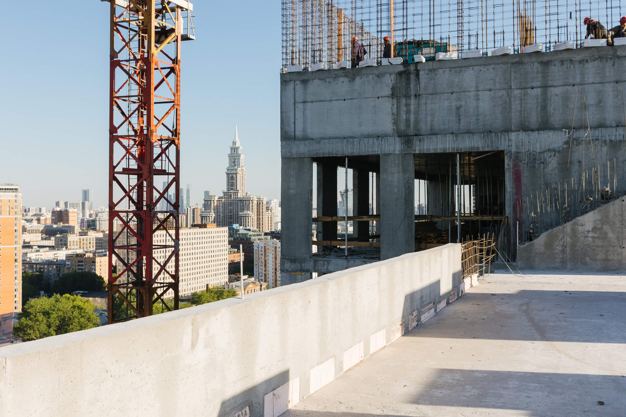 Этап 1.1 (паркинг): армирование/бетонирование стен и покрытия паркинга и рампы. Гидроизоляция наружных стен и кровли стилобата. Устройство пристенного дренажа, прокладка наружных инженерных систем. Отсыпка пазух котлована, кладка стен и перегородок подземного этажа. Отделка технических помещений. Ведутся работы по устройству отопления, вентиляции, противопожарного водопровода в рамках внутренних инженерных систем.