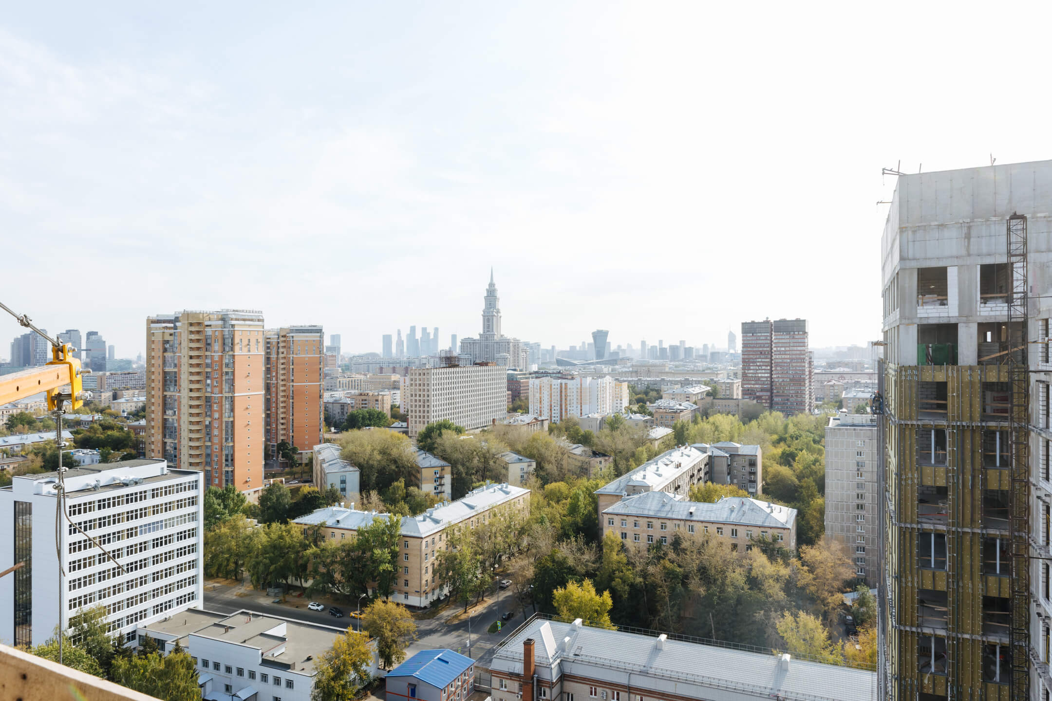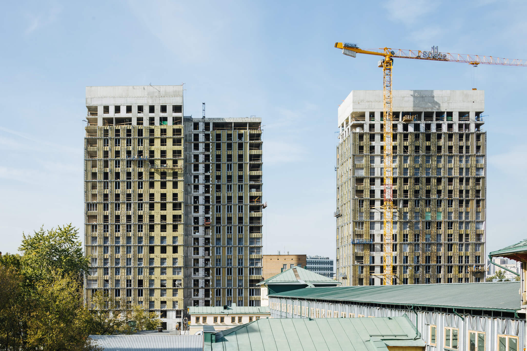 Этап 1.1 (корпус 1). Ведутся кровельные работы. Монолитные работы завершены. Ведутся каменные работы на 15-21 этажах. Фасад: монтаж противопожарной отсечки, монтаж минераловатного утеплителя, монтаж подсистемы, монтаж облицовки из натурального камня, монтаж окон типовых этажей. ВИС: ведутся работ по отоплению, вентиляции, противопожарному водопроводу; ведутся электромонтажные работы, ведутся отделочные работы на 3-9 этаже.