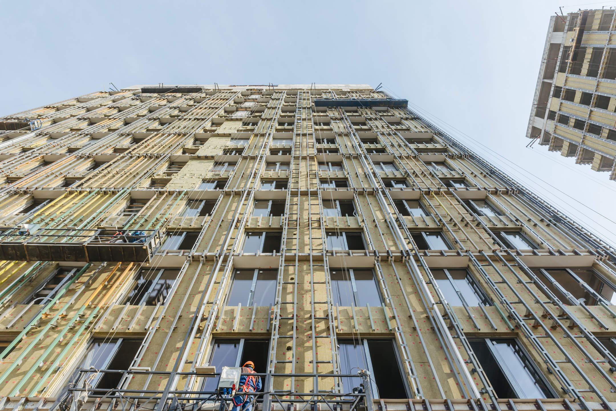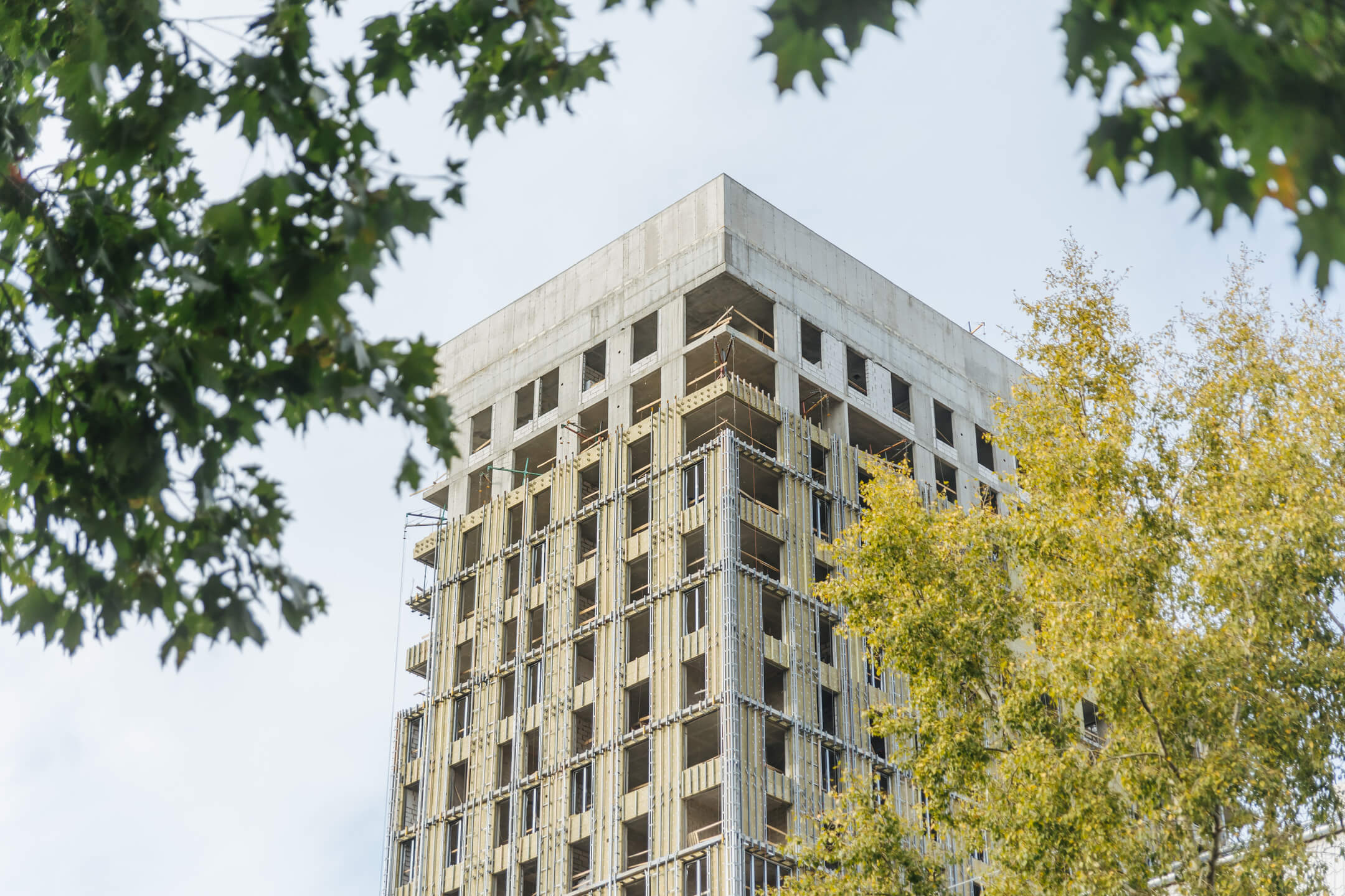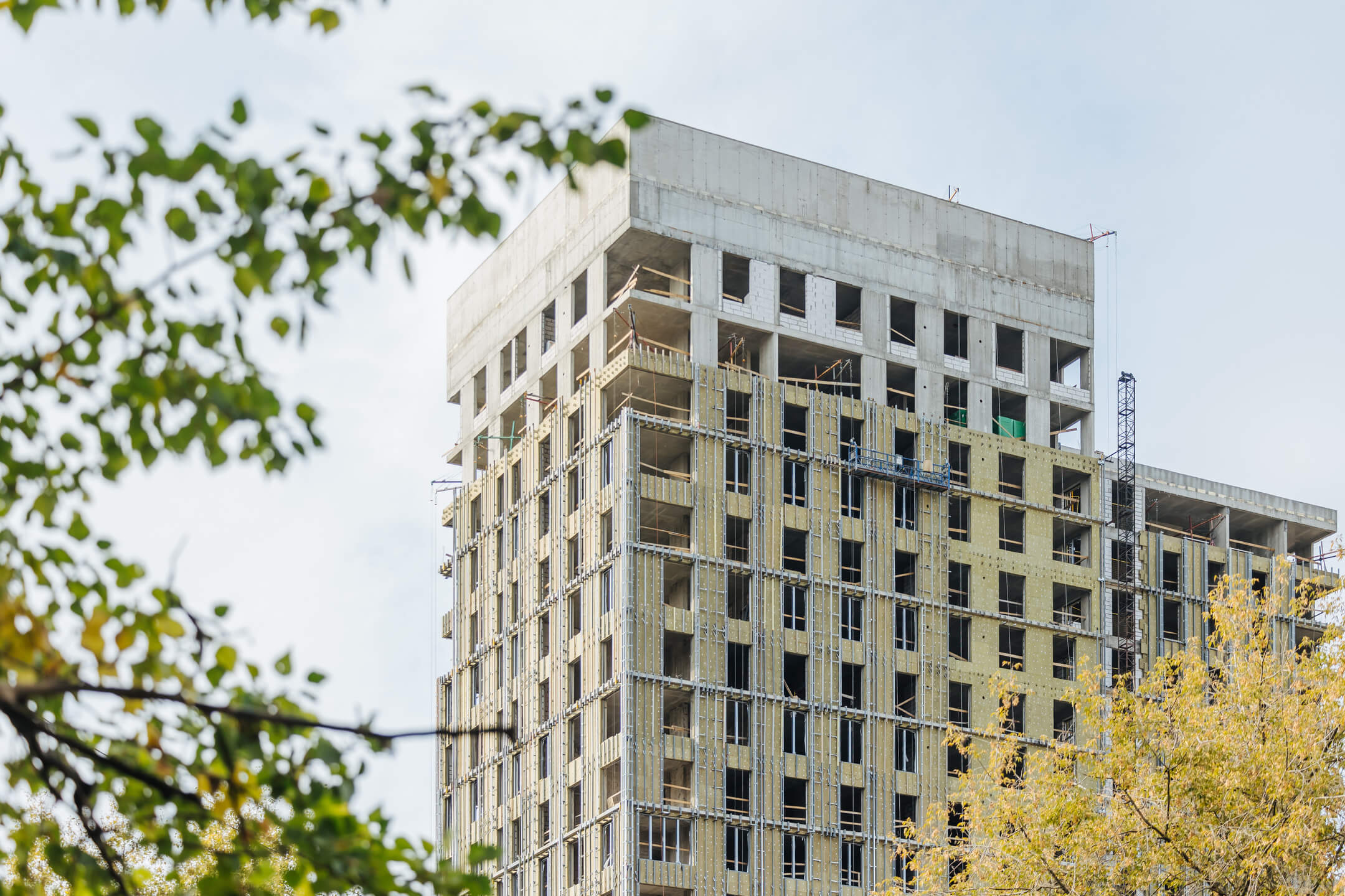 Этап 1.1 (корпус 2). Лестничные марши смонтированы. Внутренние каменные работы завершены. Ведутся отделочные работы на 3-12 этажах. Фасад: монтаж противопожарной отсечки, монтаж минераловатного утеплителя, монтаж подсистемы, монтаж облицовки из натурального камня, монтаж окон типовых этажей. ВИС: ведутся работ по отоплению, вентиляции, противопожарному водопроводу, ведутся электромонтажные работы.