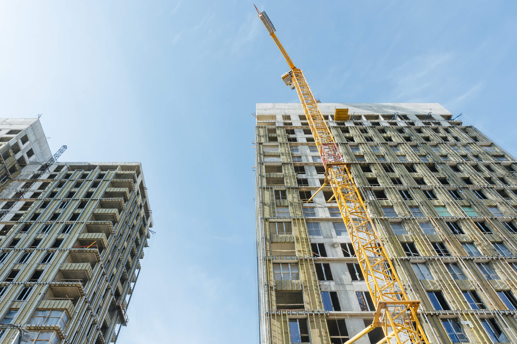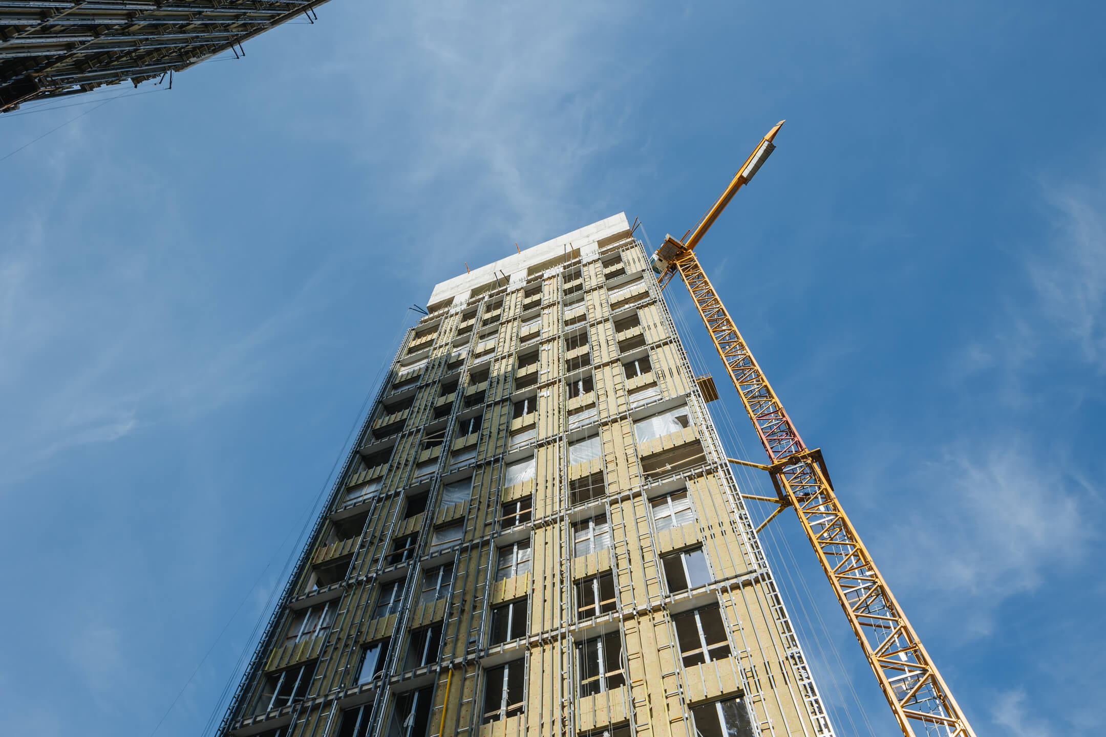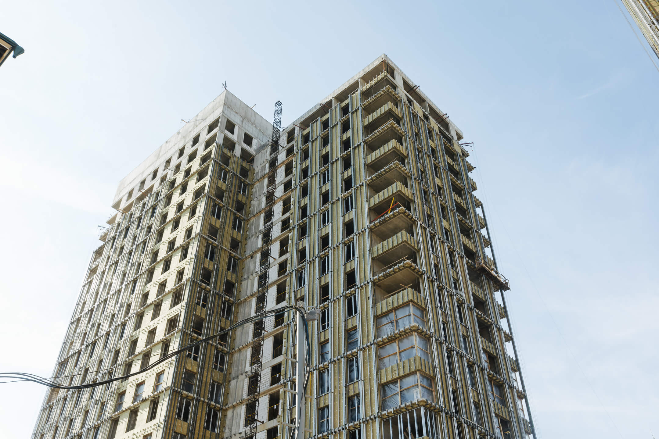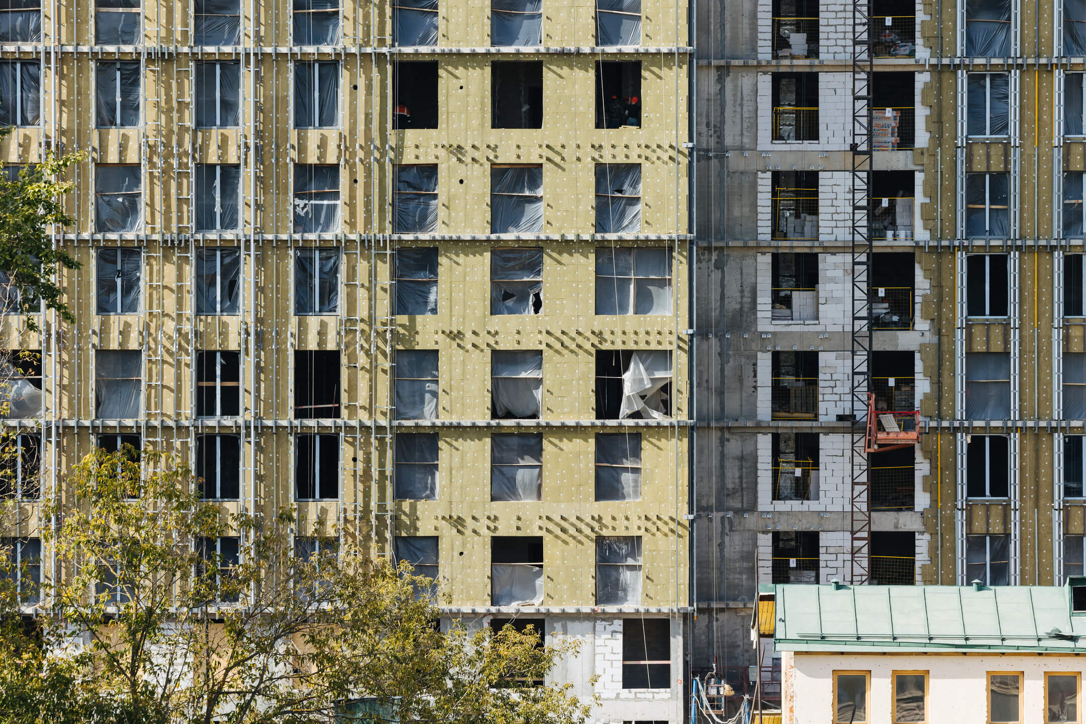 Этап 1.1 (корпус 2). Лестничные марши смонтированы. Внутренние каменные работы завершены. Ведутся отделочные работы на 3-12 этажах. Фасад: монтаж противопожарной отсечки, монтаж минераловатного утеплителя, монтаж подсистемы, монтаж облицовки из натурального камня, монтаж окон типовых этажей. ВИС: ведутся работ по отоплению, вентиляции, противопожарному водопроводу, ведутся электромонтажные работы.