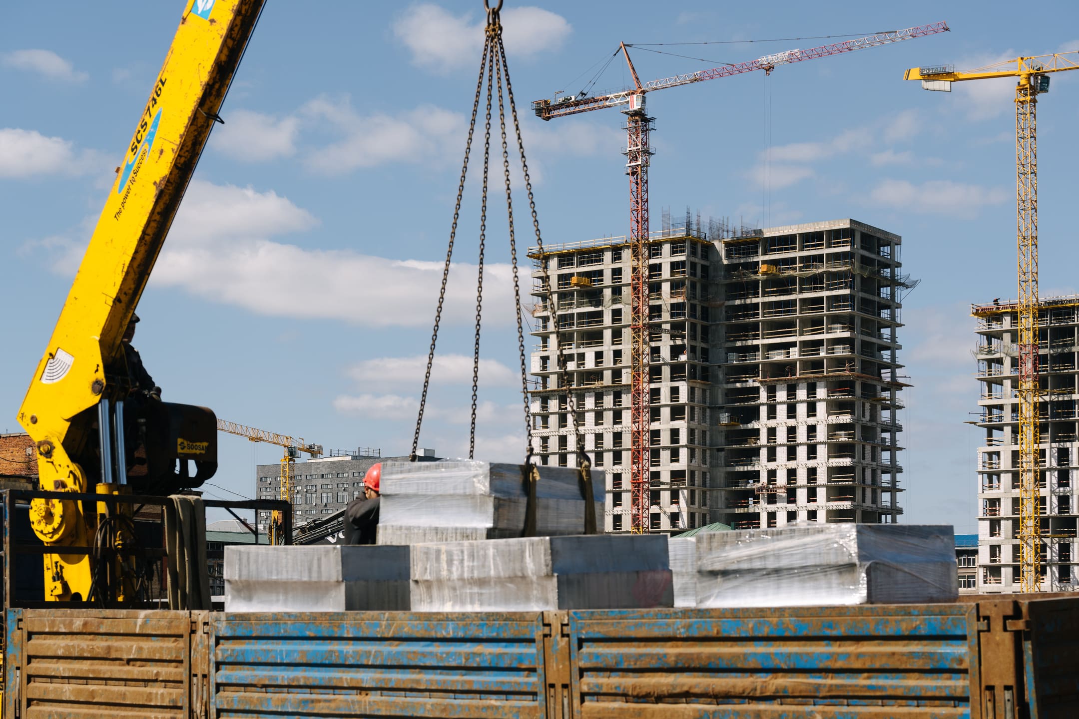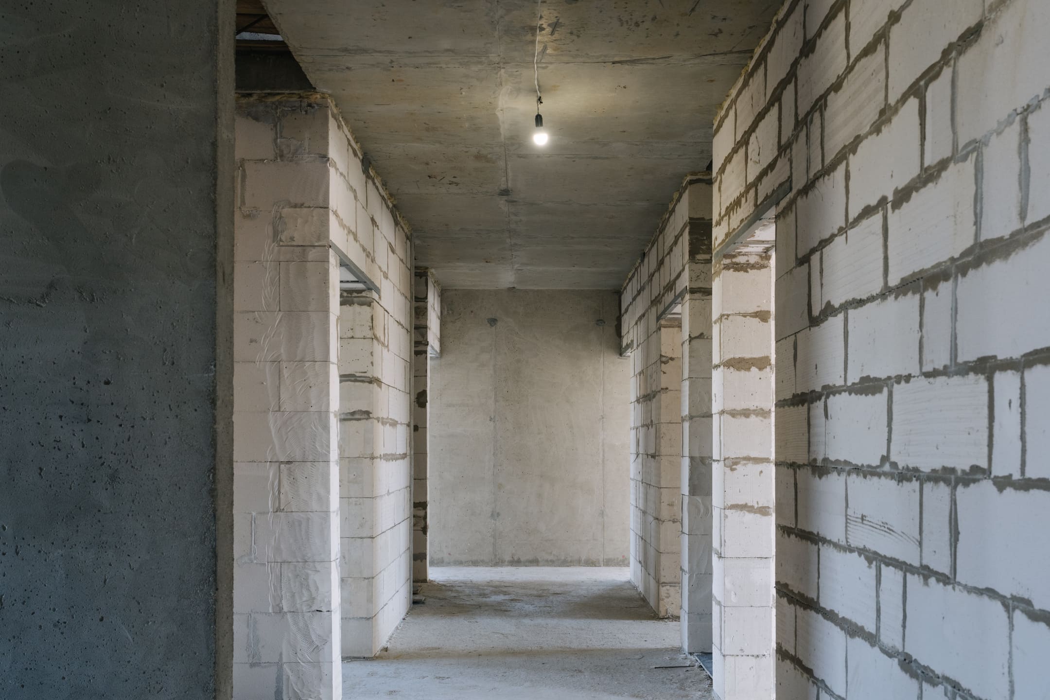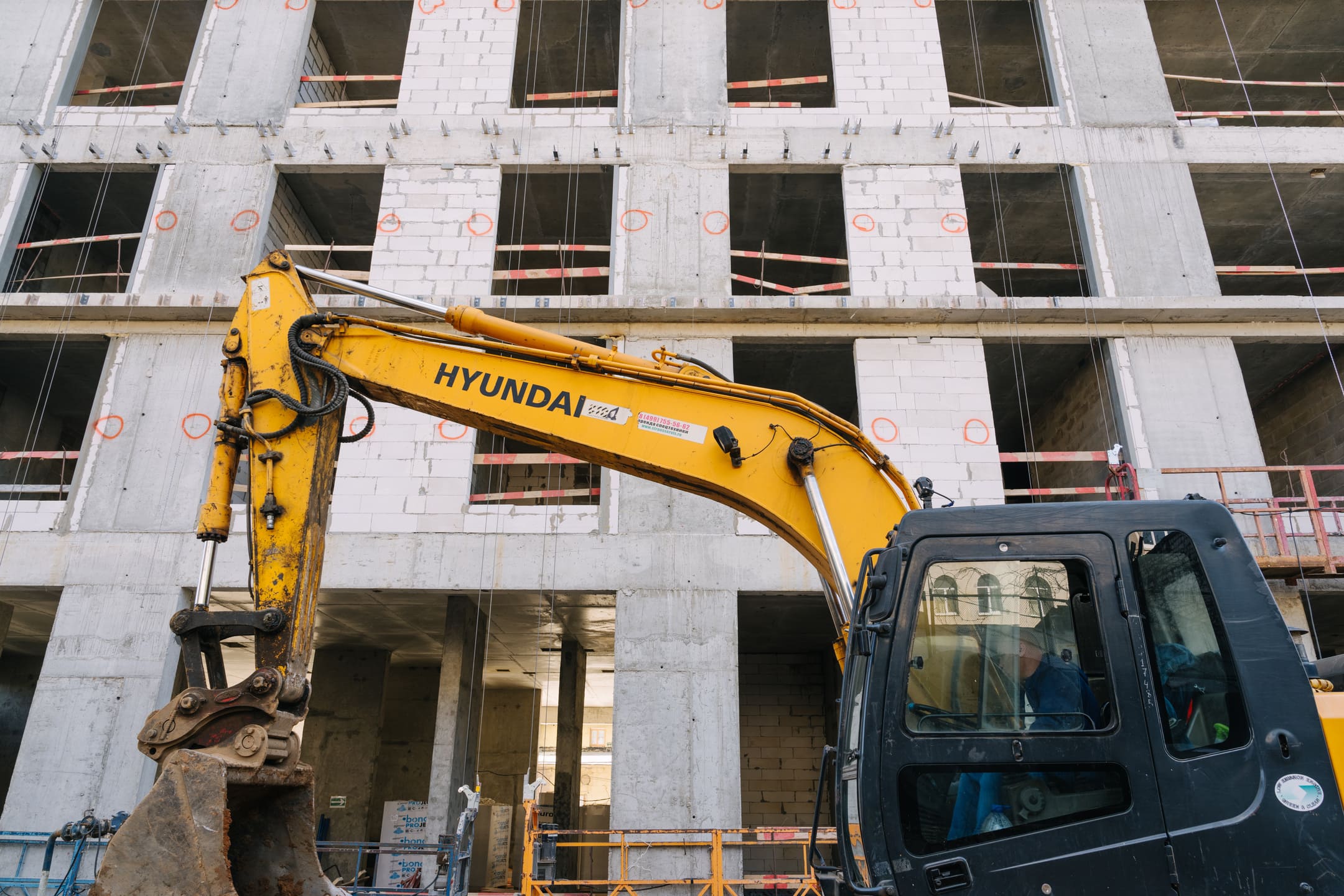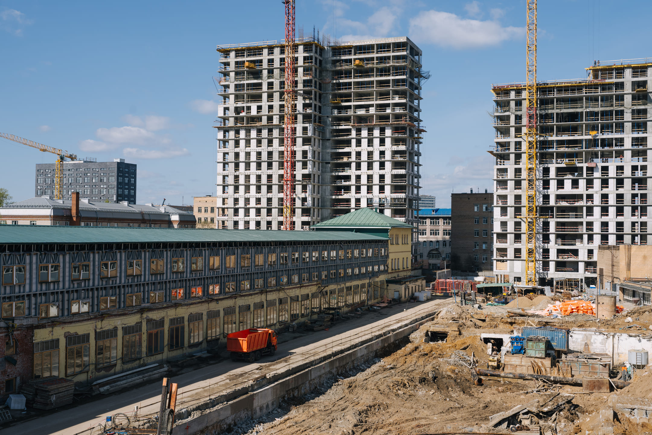 Этап 1.1 (паркинг): армирование/бетонирование стен и покрытия паркинга, рампы. Гидроизоляция наружных стен и кровли стилобата, устройство пристенного дренажа, прокладка наружных инженерных систем, отсыпка пазух котлована, кладка стен и перегородок подземного этажа.
