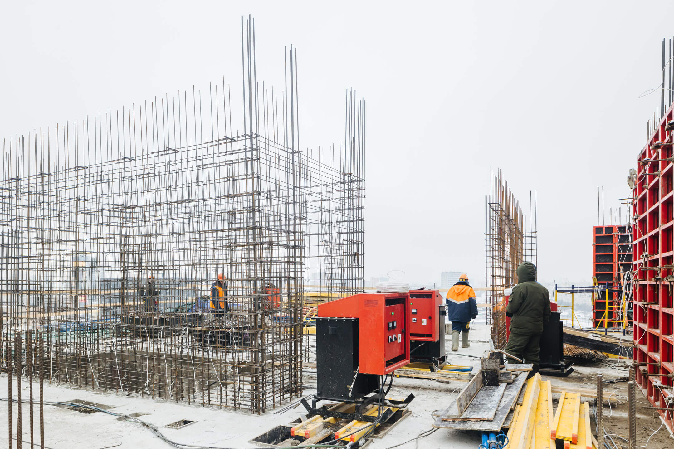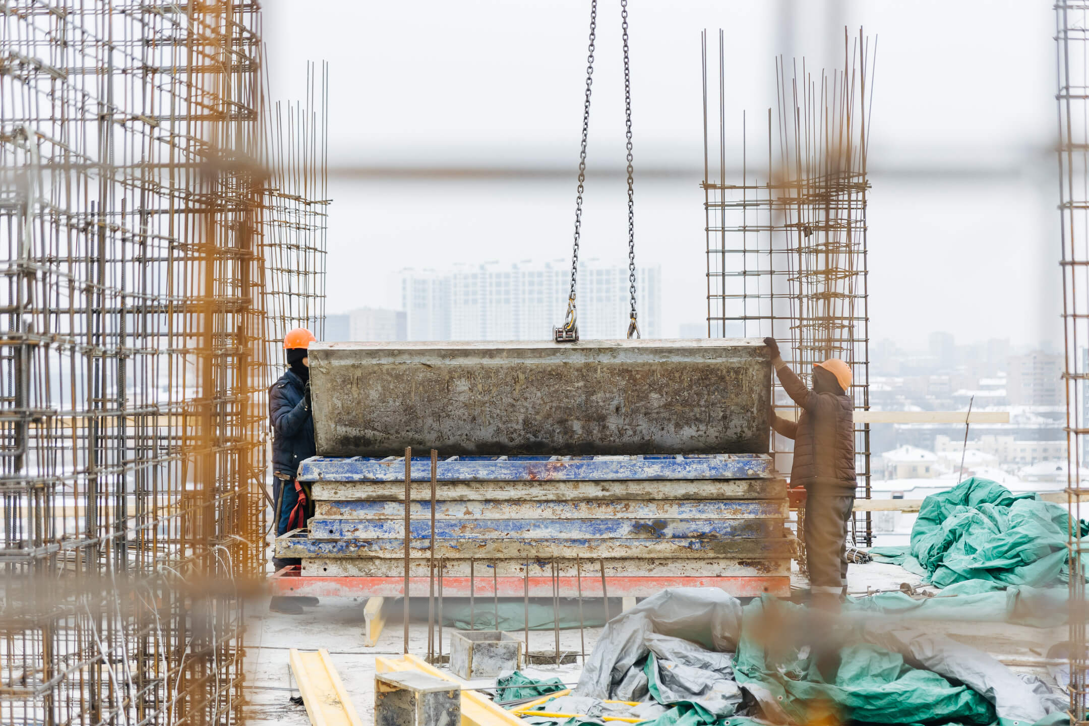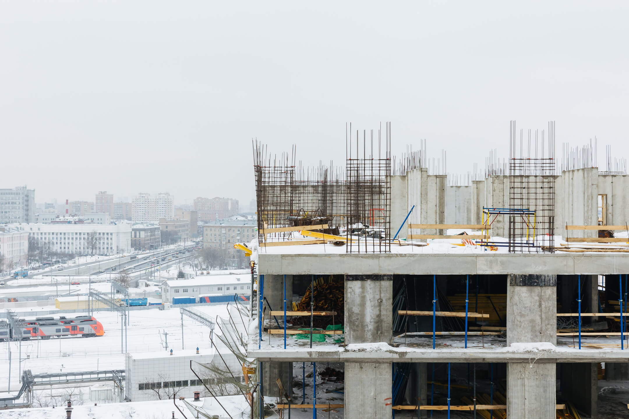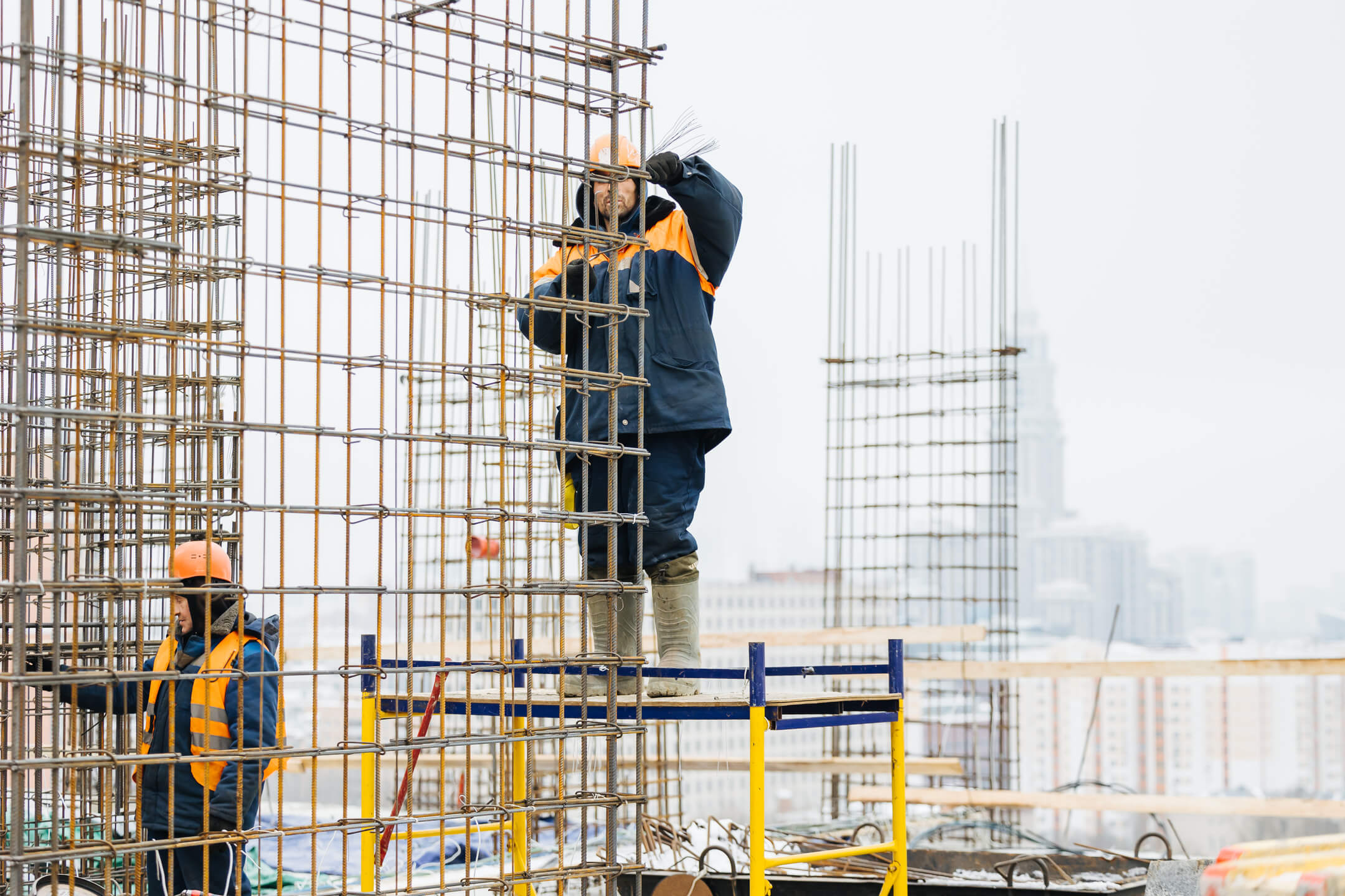 Этап 1.1 (корпус 1): работы по армированию/бетонированию плиты перекрытия 16 этажа и вертикальных конструкций 17 этажа, кладочные работы на 2-8 этажах.
