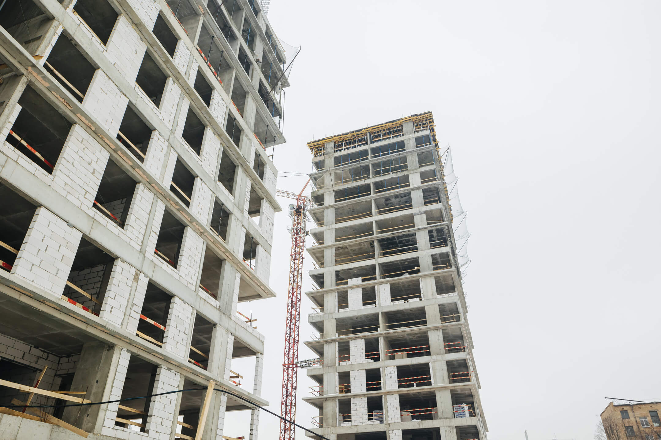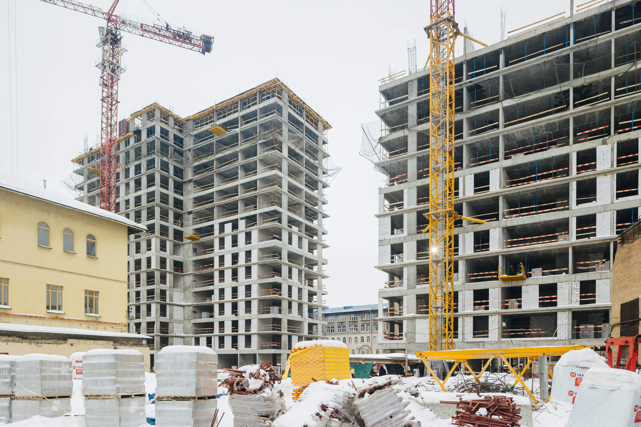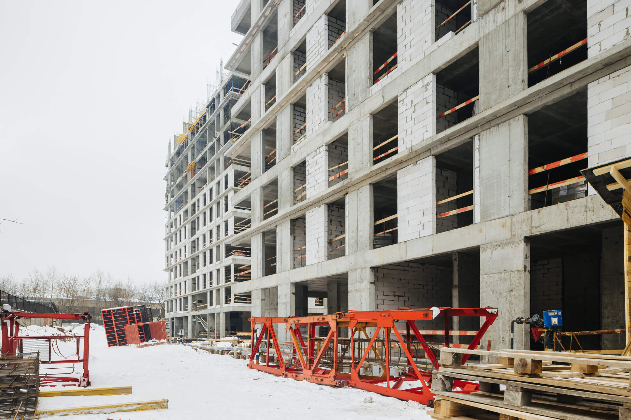 Этап 1.1 (корпус 2): работы по армированию/бетонированию плиты перекрытия и стен 12 этажа, кладочные работы на 2-7 этажах.